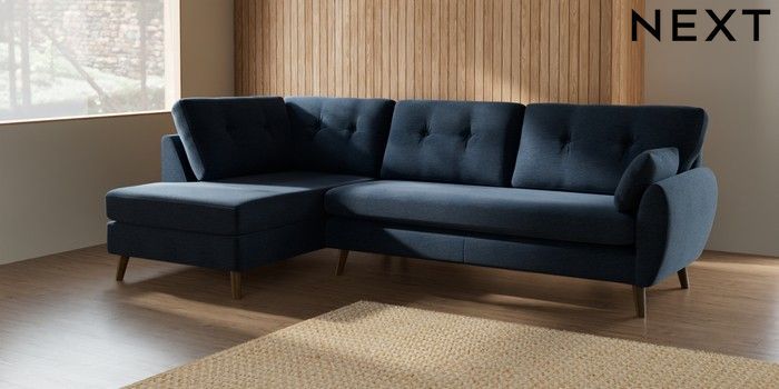 7.2.10 Wilson Buttoned Back Large Corner Chaise - Left Hand Ripple Chenille Dark Blue Retro Tapered - Mid | Made Click here to use our website with more accessibility support, for example screen readers