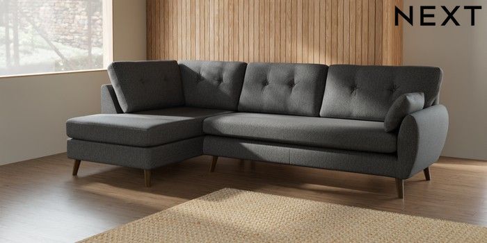 7.2.10 Wilson Buttoned Back Large Corner Chaise - Left Hand Tweedy Chenille Dark Grey Retro Tapered - Mid | Made Click here to use our website with more accessibility support, for example screen readers