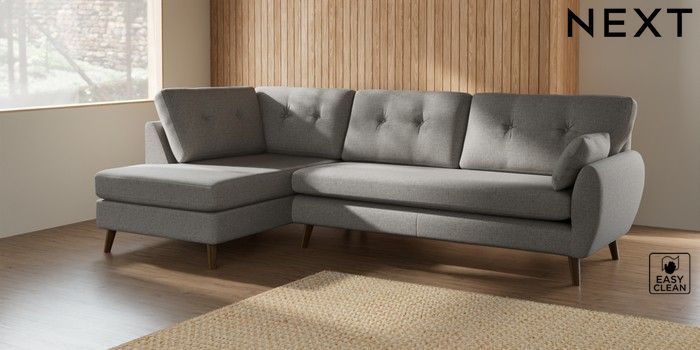7.2.10 Wilson Buttoned Back Large Corner Chaise - Left Hand Woven Chenille Easy Clean Light Grey Retro Tapered - Mid | Made Click here to use our website with more accessibility support, for example screen readers
