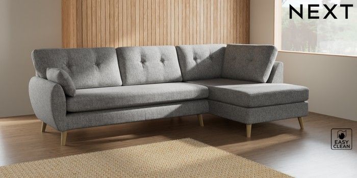 7.2.10 Wilson Buttoned Back Large Corner Chaise - Right Hand Chunky Boucle Easy Clean Light Grey Retro Tapered - Light | Made Click here to use our website with more accessibility support, for example screen readers