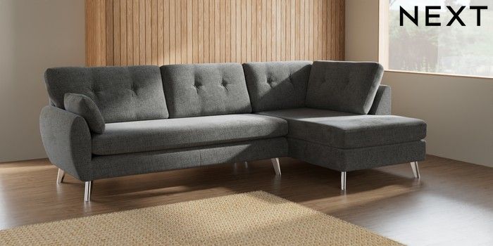 7.2.10 Wilson Buttoned Back Large Corner Chaise - Right Hand Chunky Chenille Dark Grey Metal Tapered - Chrome | Made Click here to use our website with more accessibility support, for example screen readers