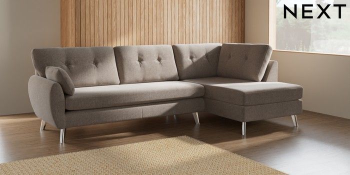 7.2.10 Wilson Buttoned Back Large Corner Chaise - Right Hand Chunky Chenille Light Dove Metal Tapered - Chrome | Made Click here to use our website with more accessibility support, for example screen readers