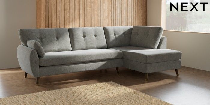 7.2.10 Wilson Buttoned Back Large Corner Chaise - Right Hand Chunky Chenille Light Grey Low Retro Tapered Metal Cap - Mid | Made Click here to use our website with more accessibility support, for example screen readers