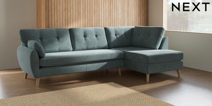 7.2.10 Wilson Buttoned Back Large Corner Chaise - Right Hand Chunky Chenille Light Teal Green Retro Tapered - Light | Made Click here to use our website with more accessibility support, for example screen readers