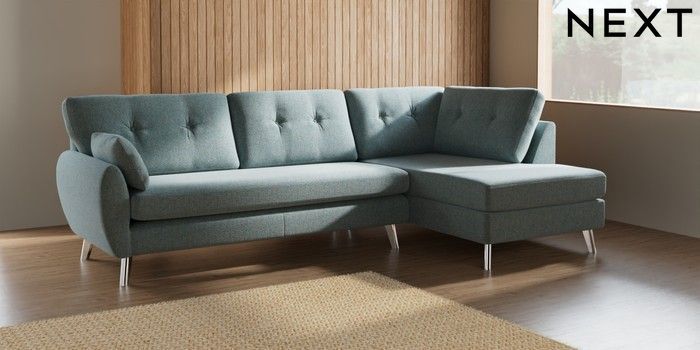 7.2.10 Wilson Buttoned Back Large Corner Chaise - Right Hand Chunky Marl Mid Blue Metal Tapered - Chrome | Made Click here to use our website with more accessibility support, for example screen readers