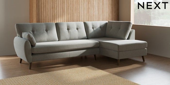 7.2.10 Wilson Buttoned Back Large Corner Chaise - Right Hand Chunky Texture Dove Retro Tapered - Mid | Made Click here to use our website with more accessibility support, for example screen readers