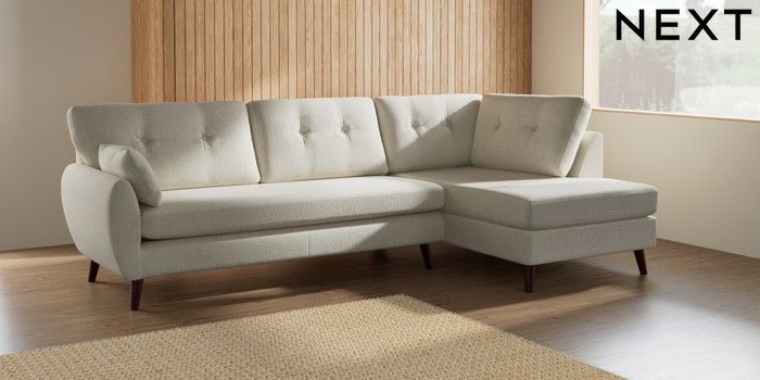 7.2.10 Wilson Buttoned Back Large Corner Chaise - Right Hand Chunky Texture Oyster Retro Tapered - Dark Brown | Made Click here to use our website with more accessibility support, for example screen readers