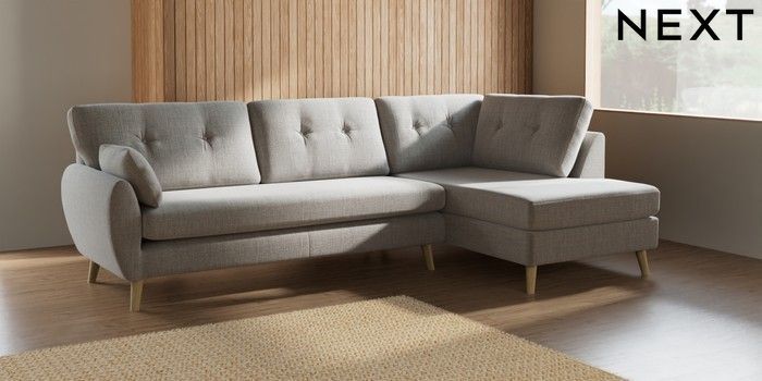 7.2.10 Wilson Buttoned Back Large Corner Chaise - Right Hand Chunky Weave Dove Grey Retro Tapered - Light | Made Click here to use our website with more accessibility support, for example screen readers
