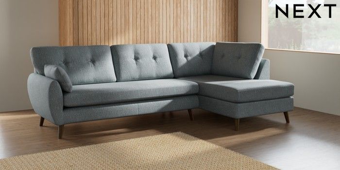 7.2.10 Wilson Buttoned Back Large Corner Chaise - Right Hand Chunky Weave Mid Blue Retro Tapered - Mid | Made Click here to use our website with more accessibility support, for example screen readers