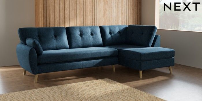 7.2.10 Wilson Buttoned Back Large Corner Chaise - Right Hand Cotswold Chenille Dark Blue Retro Tapered - Light | Made Click here to use our website with more accessibility support, for example screen readers