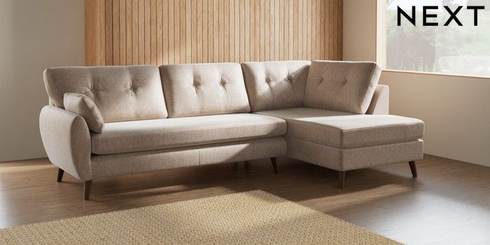 7.2.10 Wilson Buttoned Back Large Corner Chaise - Right Hand Cotswold Chenille Light Natural Retro Tapered - Mid | Made Click here to use our website with more accessibility support, for example screen readers