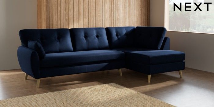 7.2.10 Wilson Buttoned Back Large Corner Chaise - Right Hand Luxe Chenille Navy Blue Retro Tapered - Light | Made Click here to use our website with more accessibility support, for example screen readers