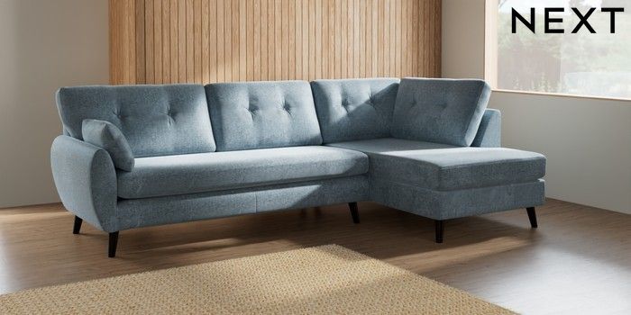 7.2.10 Wilson Buttoned Back Large Corner Chaise - Right Hand Plush Chenille Light Blue Retro Tapered - Dark | Made Click here to use our website with more accessibility support, for example screen readers