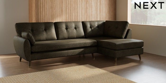 7.2.10 Wilson Buttoned Back Large Corner Chaise - Right Hand Plush Chenille Moss Green Low Retro Tapered Metal Cap - Mid | Made Click here to use our website with more accessibility support, for example screen readers