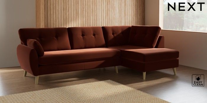 7.2.10 Wilson Buttoned Back Large Corner Chaise - Right Hand Plush Velvet Easy Clean Ginger Orange Retro Tapered - Light | Made Click here to use our website with more accessibility support, for example screen readers