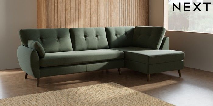 7.2.10 Wilson Buttoned Back Large Corner Chaise - Right Hand Relaxed Linen Look Dark Green Retro Tapered - Mid | Made Click here to use our website with more accessibility support, for example screen readers