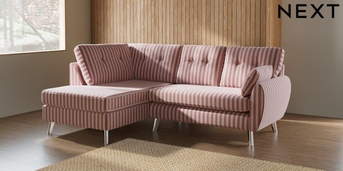 7.2.10 Wilson Buttoned Back Medium Corner Chaise - Left Hand Bold Chenille Stripe Dark Pink Metal Tapered - Chrome | Made Click here to use our website with more accessibility support, for example screen readers