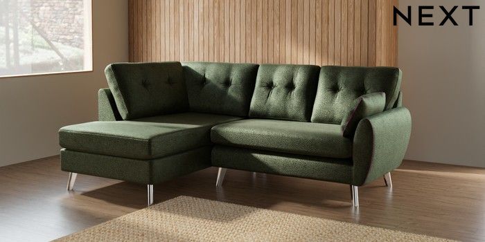 7.2.10 Wilson Buttoned Back Medium Corner Chaise - Left Hand Boucle Chenille Dark Moss Green Metal Tapered - Chrome | Made Click here to use our website with more accessibility support, for example screen readers
