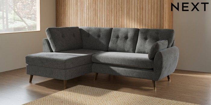 7.2.10 Wilson Buttoned Back Medium Corner Chaise - Left Hand Chunky Chenille Dark Grey Low Retro Tapered Metal Cap - Mid | Made Click here to use our website with more accessibility support, for example screen readers