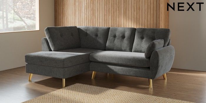 7.2.10 Wilson Buttoned Back Medium Corner Chaise - Left Hand Chunky Chenille Dark Grey Metal Tapered - Gold | Made Click here to use our website with more accessibility support, for example screen readers