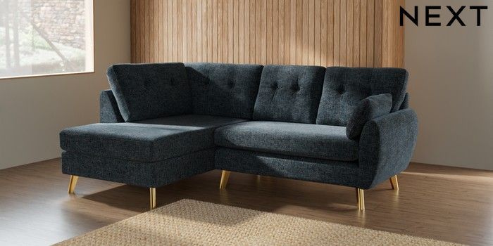 7.2.10 Wilson Buttoned Back Medium Corner Chaise - Left Hand Chunky Chenille Dark Navy Blue Metal Tapered - Gold | Made Click here to use our website with more accessibility support, for example screen readers