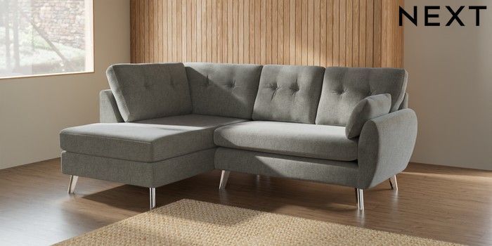 7.2.10 Wilson Buttoned Back Medium Corner Chaise - Left Hand Chunky Chenille Light Grey Metal Tapered - Chrome | Made Click here to use our website with more accessibility support, for example screen readers
