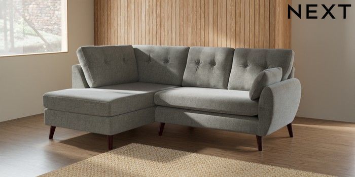 7.2.10 Wilson Buttoned Back Medium Corner Chaise - Left Hand Chunky Chenille Light Grey Retro Tapered - Dark Brown | Made Click here to use our website with more accessibility support, for example screen readers