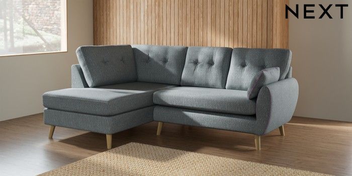 7.2.10 Wilson Buttoned Back Medium Corner Chaise - Left Hand Chunky Weave Mid Blue Retro Tapered - Light | Made Click here to use our website with more accessibility support, for example screen readers