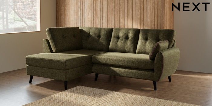 7.2.10 Wilson Buttoned Back Medium Corner Chaise - Left Hand Cotswold Chenille Dark Green Retro Tapered - Dark | Made Click here to use our website with more accessibility support, for example screen readers
