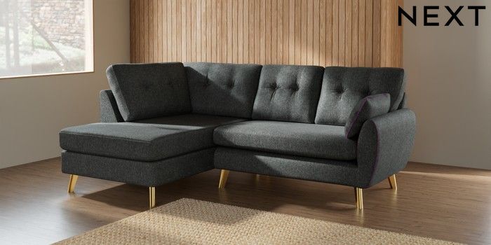 7.2.10 Wilson Buttoned Back Medium Corner Chaise - Left Hand Cotswold Chenille Dark Grey Metal Tapered - Gold | Made Click here to use our website with more accessibility support, for example screen readers