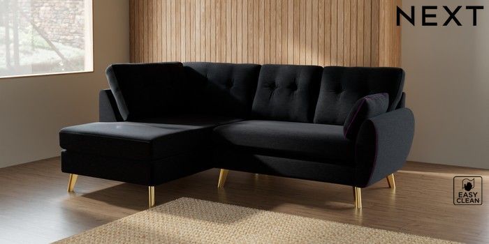 7.2.10 Wilson Buttoned Back Medium Corner Chaise - Left Hand Fine Chenille Easy Clean Black Metal Tapered - Gold | Made Click here to use our website with more accessibility support, for example screen readers