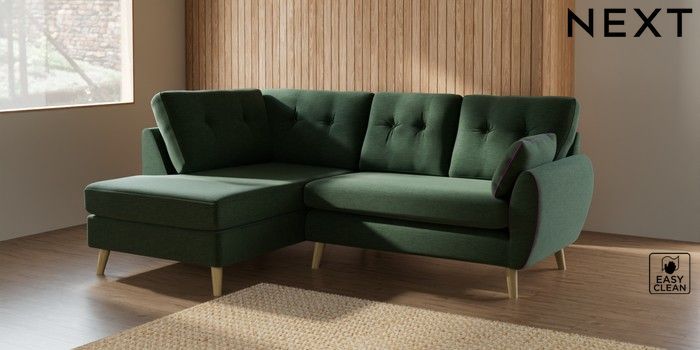 7.2.10 Wilson Buttoned Back Medium Corner Chaise - Left Hand Fine Chenille Easy Clean Mid Khaki Green Retro Tapered - Light | Made Click here to use our website with more accessibility support, for example screen readers