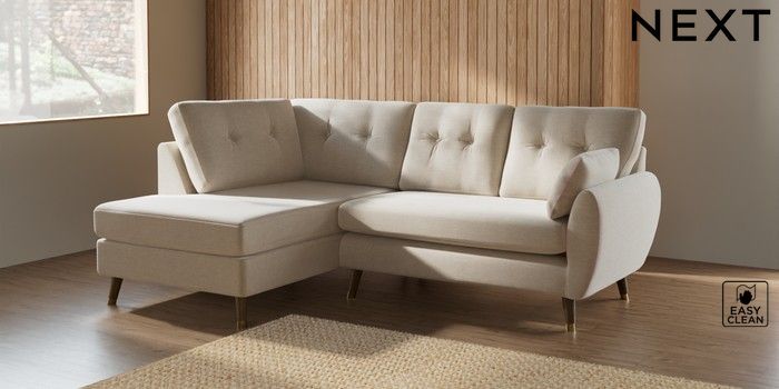 7.2.10 Wilson Buttoned Back Medium Corner Chaise - Left Hand Fine Chenille Easy Clean Oyster Low Retro Tapered Metal Cap - Mid | Made Click here to use our website with more accessibility support, for example screen readers