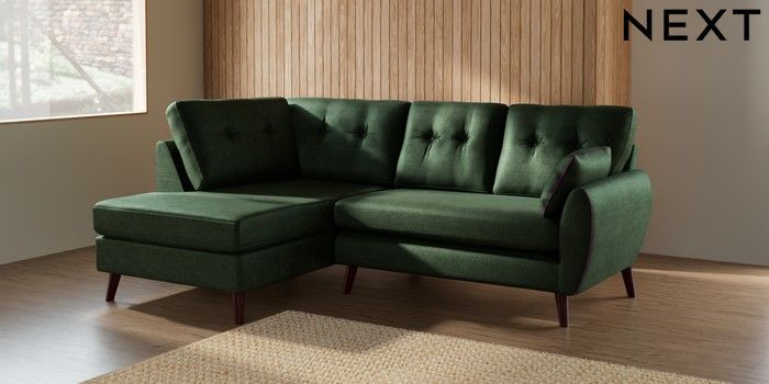 7.2.10 Wilson Buttoned Back Medium Corner Chaise - Left Hand Luxe Chenille Dark Green Retro Tapered - Dark Brown | Made Click here to use our website with more accessibility support, for example screen readers