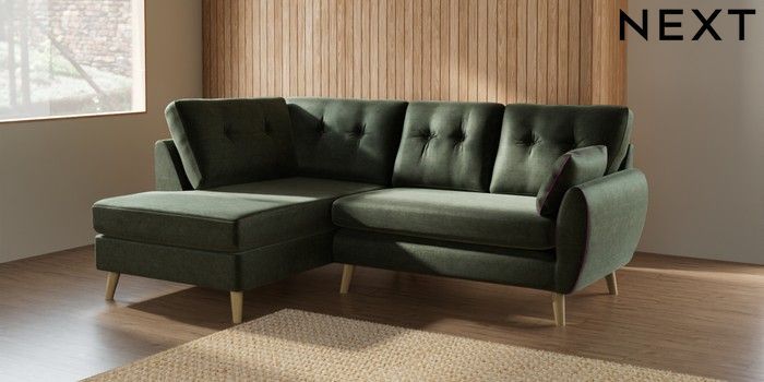 7.2.10 Wilson Buttoned Back Medium Corner Chaise - Left Hand Luxe Chenille Mid Green Retro Tapered - Light | Made Click here to use our website with more accessibility support, for example screen readers