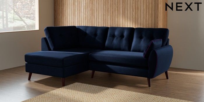 7.2.10 Wilson Buttoned Back Medium Corner Chaise - Left Hand Luxe Chenille Navy Blue Retro Tapered - Dark Brown | Made Click here to use our website with more accessibility support, for example screen readers