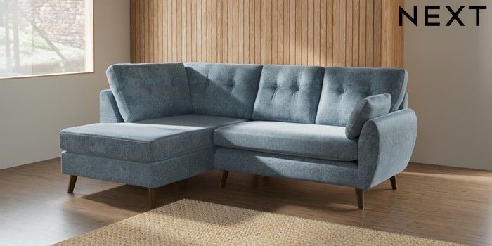 7.2.10 Wilson Buttoned Back Medium Corner Chaise - Left Hand Plush Chenille Light Blue Retro Tapered - Mid | Made Click here to use our website with more accessibility support, for example screen readers