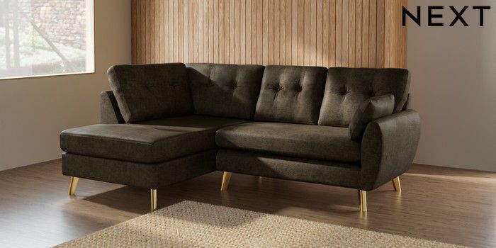 7.2.10 Wilson Buttoned Back Medium Corner Chaise - Left Hand Plush Chenille Moss Green Metal Tapered - Gold | Made Click here to use our website with more accessibility support, for example screen readers