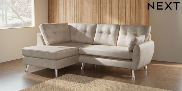 7.2.10 Wilson Buttoned Back Medium Corner Chaise - Left Hand Plush Chenille Oyster Metal Tapered - Chrome | Made Click here to use our website with more accessibility support, for example screen readers