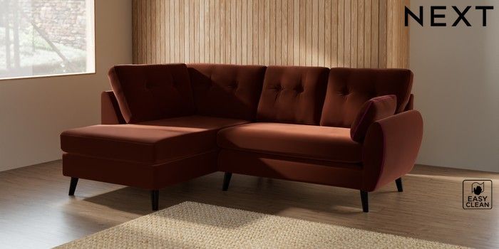 7.2.10 Wilson Buttoned Back Medium Corner Chaise - Left Hand Plush Velvet Easy Clean Ginger Orange Retro Tapered - Dark | Made Click here to use our website with more accessibility support, for example screen readers