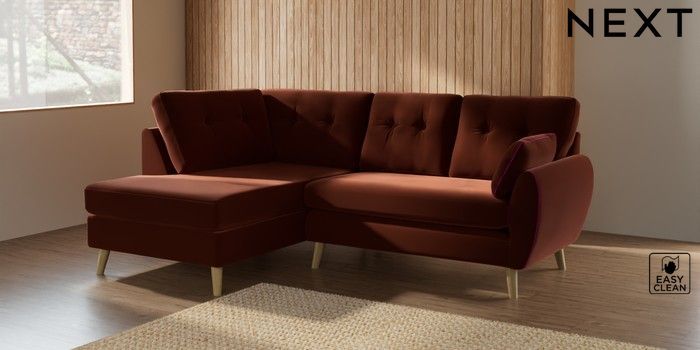 7.2.10 Wilson Buttoned Back Medium Corner Chaise - Left Hand Plush Velvet Easy Clean Ginger Orange Retro Tapered - Light | Made Click here to use our website with more accessibility support, for example screen readers