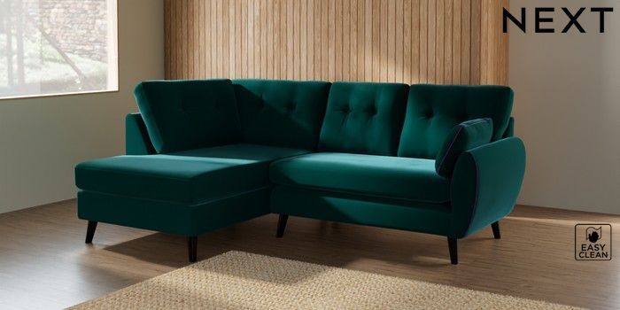 7.2.10 Wilson Buttoned Back Medium Corner Chaise - Left Hand Plush Velvet Easy Clean Juniper Green Retro Tapered - Dark | Made Click here to use our website with more accessibility support, for example screen readers