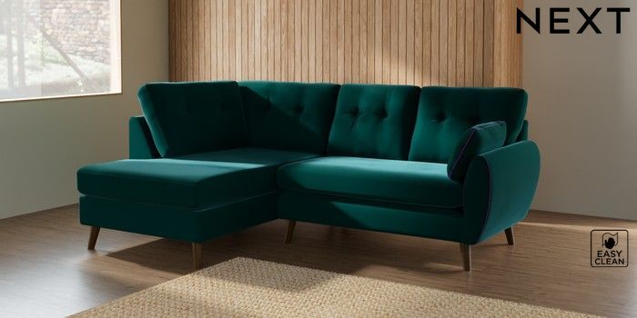 7.2.10 Wilson Buttoned Back Medium Corner Chaise - Left Hand Plush Velvet Easy Clean Juniper Green Retro Tapered - Mid | Made Click here to use our website with more accessibility support, for example screen readers