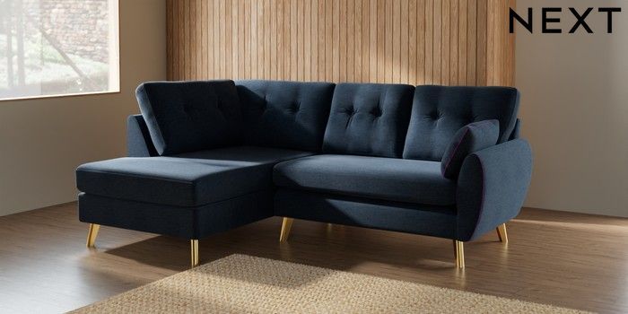 7.2.10 Wilson Buttoned Back Medium Corner Chaise - Left Hand Ripple Chenille Dark Blue Metal Tapered - Gold | Made Click here to use our website with more accessibility support, for example screen readers
