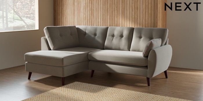7.2.10 Wilson Buttoned Back Medium Corner Chaise - Left Hand Ripple Chenille Light Natural Retro Tapered - Dark Brown | Made Click here to use our website with more accessibility support, for example screen readers