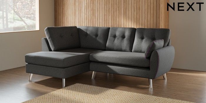 7.2.10 Wilson Buttoned Back Medium Corner Chaise - Left Hand Tweedy Chenille Dark Grey Metal Tapered - Chrome | Made Click here to use our website with more accessibility support, for example screen readers