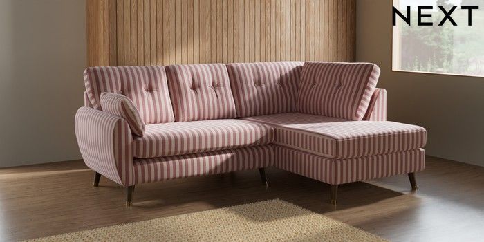 7.2.10 Wilson Buttoned Back Medium Corner Chaise - Right Hand Bold Chenille Stripe Dark Pink Low Retro Tapered Metal Cap - Mid | Made Click here to use our website with more accessibility support, for example screen readers