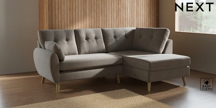 7.2.10 Wilson Buttoned Back Medium Corner Chaise - Right Hand Chunky Boucle Easy Clean Dove Retro Tapered - Light | Made Click here to use our website with more accessibility support, for example screen readers