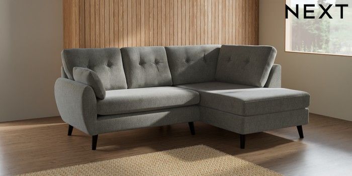 7.2.10 Wilson Buttoned Back Medium Corner Chaise - Right Hand Chunky Chenille Light Grey Retro Tapered - Dark | Made Click here to use our website with more accessibility support, for example screen readers