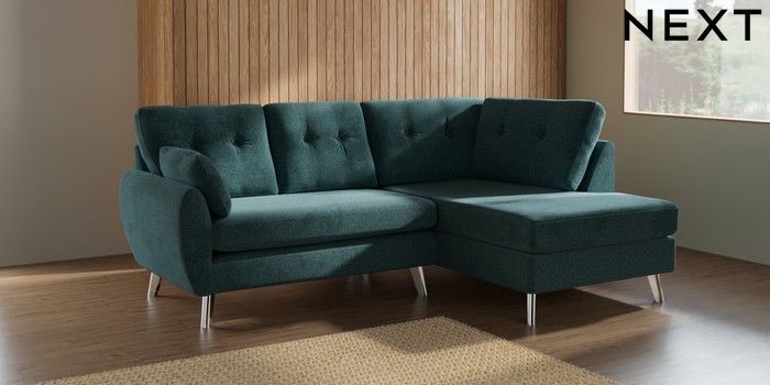 7.2.10 Wilson Buttoned Back Medium Corner Chaise - Right Hand Chunky Chenille Mid Teal Green Metal Tapered - Chrome | Made Click here to use our website with more accessibility support, for example screen readers